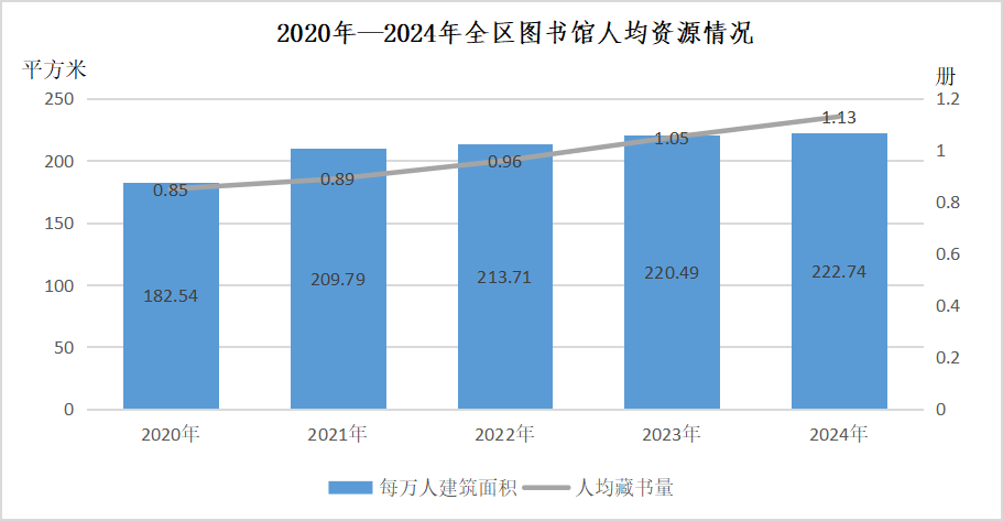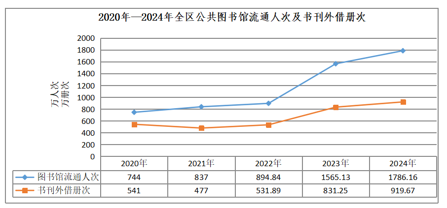 年末全区公共图书馆实际使用房屋建筑面积53.19万平方米,同比增长0.68%;图书总藏量[6]2701.40万册,同比增长6.86%;阅览室座席数4.06万个,同比增长3.57%,计算机0.59万台,供读者使用的电子阅览终端0.34万台。2024年全区平均每万人公共图书馆建筑面积222.74平方米,比上年增加2.25平方米;全区人均图书藏量1.13册,比上年增加0.08册;全区人均购书费1.38元。