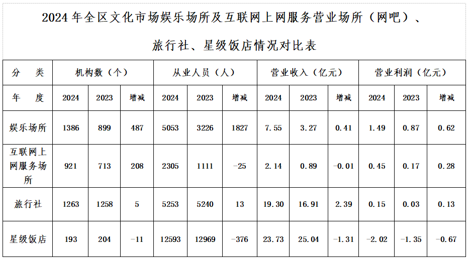 年末全区文化市场经营机构[12](含互联网上网服务营业场所、娱乐场所和文艺表演团体等)2609个,比上年增加688个;从业人员12345人,比上年增加5161人。其中娱乐场所1386个,比上年增加487个;从业人员5053人,比上年增加1827人;全年营业收入7.55亿元,营业利润1.49亿元。互联网上网服务营业场所(网吧)921个,从业人员2305人,全年营业收入2.14亿元,营业利润0.45亿元。年末全区旅行社1263个,从业人员5253人,全年营业收入19.30亿元,营业利润0.15亿元。星级饭店193家,从业人员12593人,全年营业收入23.73亿元,利润总额-2.02亿元。