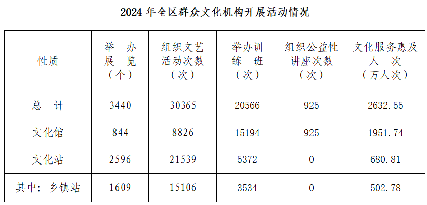 年末全区共有群众文化机构1190个,较上年减少11个。其中综合文化站1072个,较上年减少11个。年末群众文化机构从业人员4799人,比上年末增加121人。其中具有高级职称的人员445人,占9.27%;具有中级职称的人员688人,占14.34%。全区群众文化机构实际使用房屋建筑面积126.53万平方米,同比增长5.14%;业务用房面积79.47万平方米,同比增长3.56%。年末全区平均每万人群众文化设施建筑面积529.86平方米,比上年增加27.61平方米。全年全区群众文化机构共组织开展各类活动[10]55296场次,同比下降0.65%;服务人次2632.55万人次,同比增长10.58%。全区群众文化机构共有馆办文艺团体[11]356个,演出4538场,观众244.71万人次,同比增长13.85%。由文化馆(站)指导的群众业余文艺团体9507个,馆办老年大学36个。